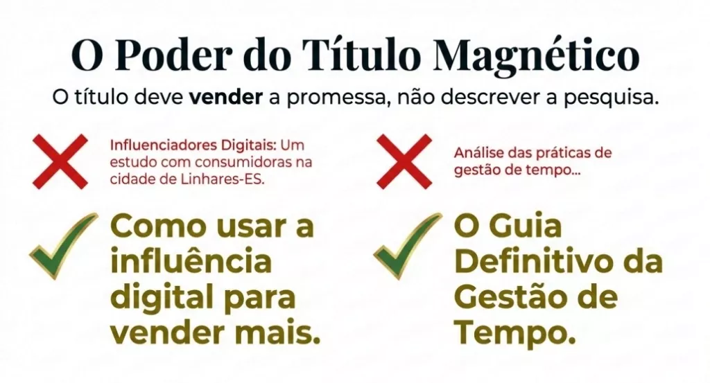 Diferente do tema, que expressa apenas uma área, o título deve ser direcional: construído com um substantivo que indica solução e sintetiza, de forma clara e impactante, o assunto e seu contexto.